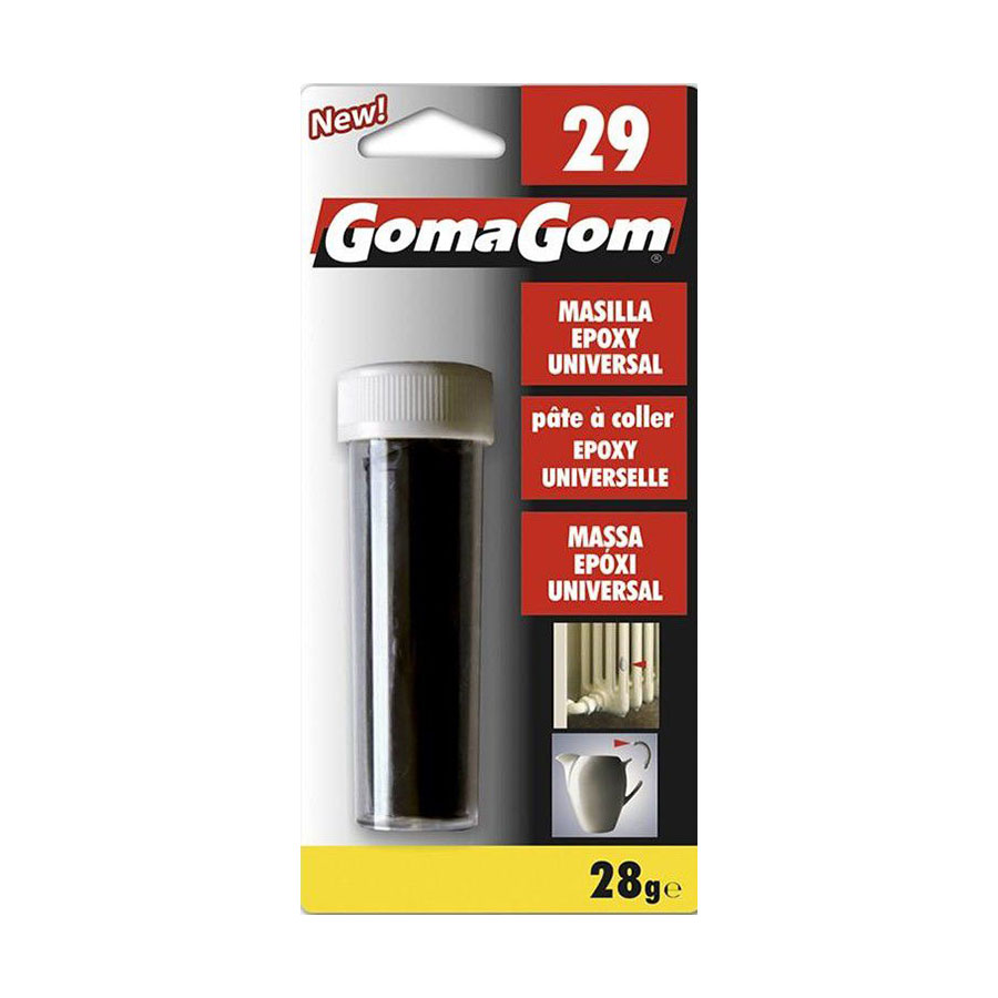 Massa Epóxi Universal GomaGom, de dois componentes que reagem quimicamente ao serem misturados. Produto rápido e de elevada resistência. Indicado para colar pedra, metal, madeira, cerâmica, porcelana, vidro e plástico. Muito útil em trabalhos de bricolage e para todo o tipo de reparações domésticas. Disponível em caixas de 12 unidades.