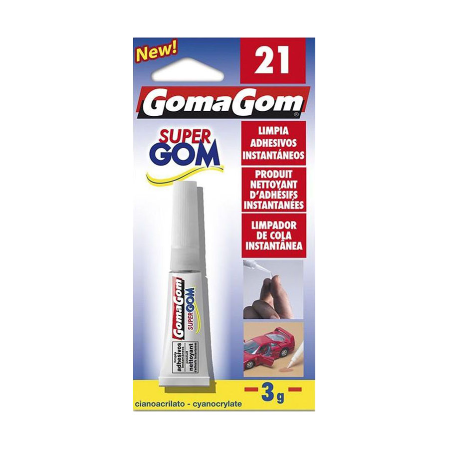 Limpador de cola instantânea GomaGom, elimina nódoas e restos de cola instantânea sobre todo os tipos de superfícies. A sua embalagem permite chegar a todos os lugares realizando uma aplicação exata e precisa, mesmo em superfícies verticais. Disponível em caixas de 24 unidades.